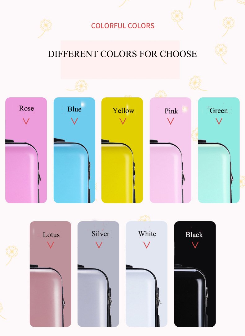 Colors: silver, sky blue, black, pink, purple, yellow, rose, light green, white